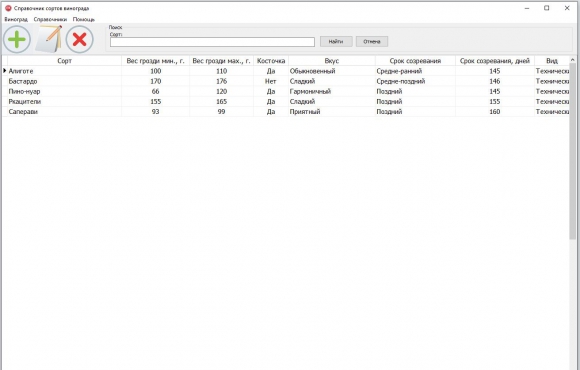 Программная часть разработанного оконного приложения состоит из множества визуальных форм, которые формируют пользовательский интерфейс для взаимодействия с базой данных. Основной функционал программы - это операции добавления, редактирования и удаления записей. Также реализован поиск по наименованиям (фильтрация) в справочниках и каталоге винограда.