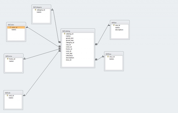 Спроектированная БД состоит из 7 связных между собой таблиц. Таблицы tblSrok, tblForms, tblColor, tblCategory, tblSize и tblVkus являются справочниками для основной таблицы tblCatalog. Во всех справочниках имеется по несколько полей. Одно поле в качестве счетчика, а второе в качестве значения характеристики того или иного сорта винограда с наименованием names. Счетчики полей в названии своих полей содержат названия своих таблиц без префиксов tbl и оканчивающиеся символами _id. В этих справочниках хранится информация о сроках созревания, формах грозди, цвете ягод, видах винограда, размерах и вкусах ягод. В таблице tblCatalog по мимо выбора значений из имеющихся справочников, описанных выше, вводится наименование о сорте винограда, вес грозди в граммах, срок созревания в днях, указание наличия или отсутствия косточки и поле memo для более подробного описания сорта винограда в справочнике.