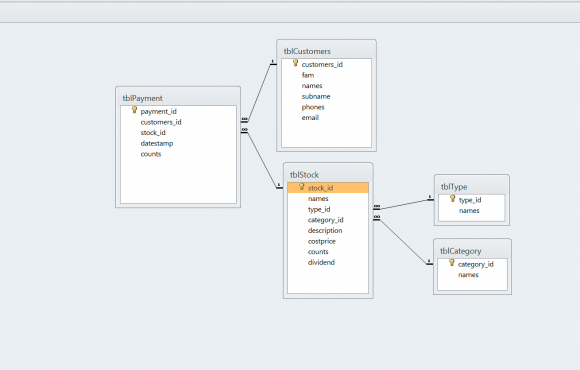 В качестве языка программирования используется Delphi XE10.1 Berlin, а в качестве хранилища данных - реляционная СУБД Access, в которой создано 5 связных таблиц отношением 1 ко многим. В таблице tblPayment содержится вся информация по сделкам, в tblCustomers - сведения об держателях акций, в таблице tblStock - сведения по акциям, в таблице tblType - хранятся типы акций (обычные, привилегированные) и в последней из таблиц tblCategory - тип ценных бумаг (акции, облигации).
