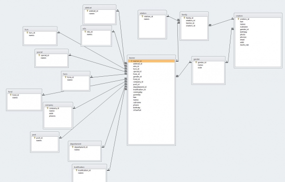 Информация в программе хранится в реляционной СУБД Access. Физически база данных состоит из 15 связных таблиц, в которых размещаются все необходимые данные по учету сведений об трудоустроенных студентах.