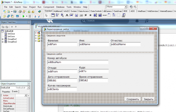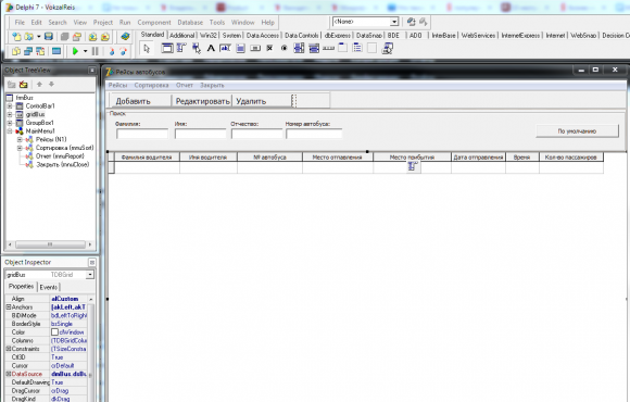Для учета трафика автовокзала разработана простая база данных в Delphi 7 для хранения информации о рейсах на автовокзале. В сделанной базе ведется учет ФИО водителя, номер автобуса, место отправления и прибытия, дата и время отправления, а также количество пассажиров. Все вводимые пользователем данные хранятся в файле db.mdb, который является СУБД Access.
