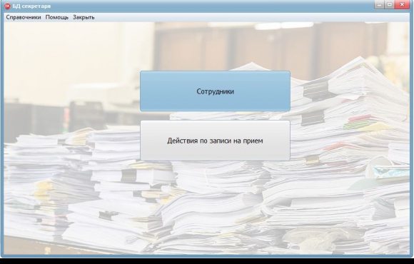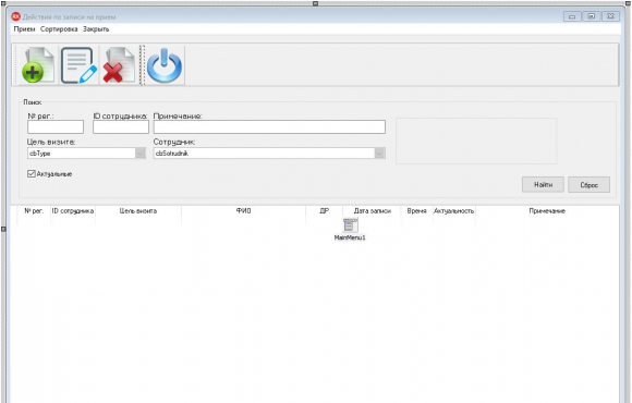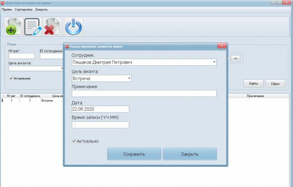 Задачей программы является автоматизация работы секретаря предприятия по формированию электронной записи заявок, на посещение руководителя, сотрудниками организации по тем или иным нуждам. Когда нужно сформировать заявку секретарь выбирает из списка необходимого сотрудника, выбирает цель визита, вводит дату и время. По базе сформированных заявок можно сделать поиск по датам, сотрудникам и целям визита.