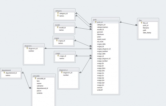 Для хранения данных выбрана СУБД Access, база данных которой состоит из 9 таблиц. Для хранения данных о полисах задействовано 7 связных между собой таблиц, а 2 оставшиеся - для ведения сведений о сотрудниках, которые могут получить доступ к базе данных. Чтобы подключиться к данным использовалась интегрированная среда программирования Delphi XE10.1 Berlin с применением технологии ADO.