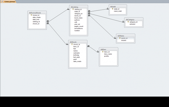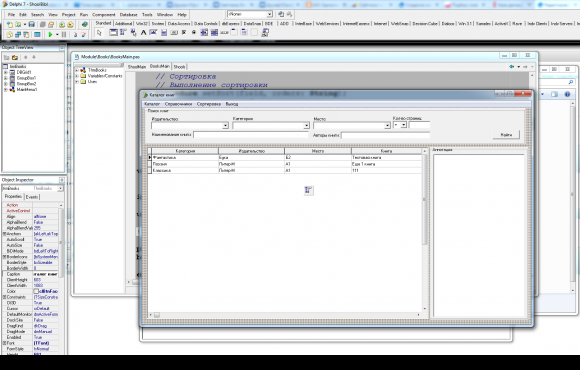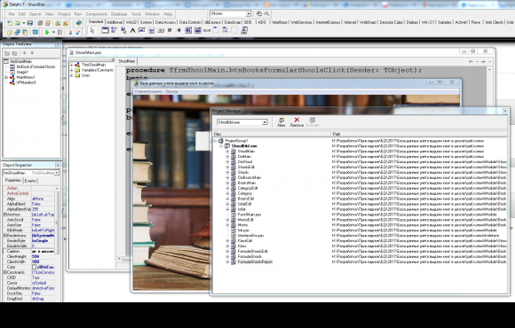 Готовый Delphi 7 проект на тему учета выдачи книг в библиотеке школы с базой данных Access. БД состоит из 7 таблиц: формуляр школьника, каталог книг, справочник школьников и их классов, места расположения книг (полки), категории книг и издательства.
