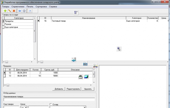 - Редактирование товаров склада (добавление, редактирование и удаление). В заносимую информацию о товаре добавляется наименование товара, категория товара (справочник), место размещения товара - склад (справочник), стоимость товара на складе, количество единиц товара, краткое описание к товару и изображение в формате bmp размером 400х315.