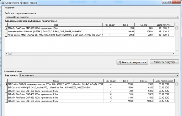 - Выбрать покупателя компьютерной техники из списка (при необходимости добавить нового).