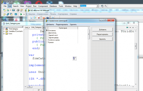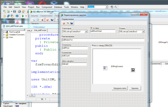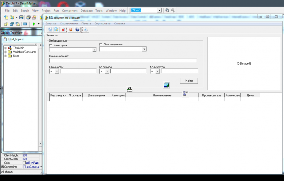 Разработанное приложение предназначено для работы с базой данных по учету закупок деталей на заводе. При выполнении закупки ведется учет количества закупаемых деталей с указанием наименования, стоимость одной единицы, страна производитель, категория, номер склада и дата закупки. Программа разработана в интегрированной среде программирования Delphi 7. Для связи базы данных и приложения используется технология ActiveX Data Objects (ADO).