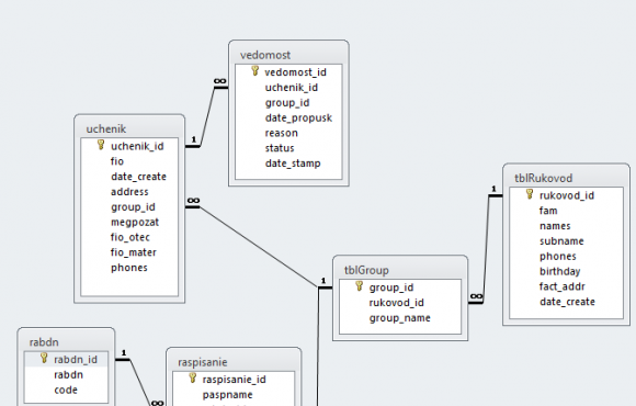 Готовый электронный журнал посещаемости детского сада в интегрированной среде программирования Delphi с ведением расписания занятий в детсаде. База данных этого проекта спроектирована в Access и содержит 7 связных таблиц, которые обеспечивают решение данной задачи по учету посещаемости детсада. Учет посещаемости в детском саду обеспечивает хранение в базе данных сведений о воспитанниках, группах, расписаниях занятий по дням недели и их посещаемости.