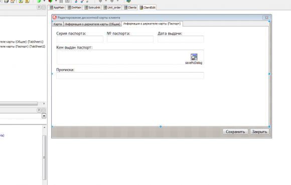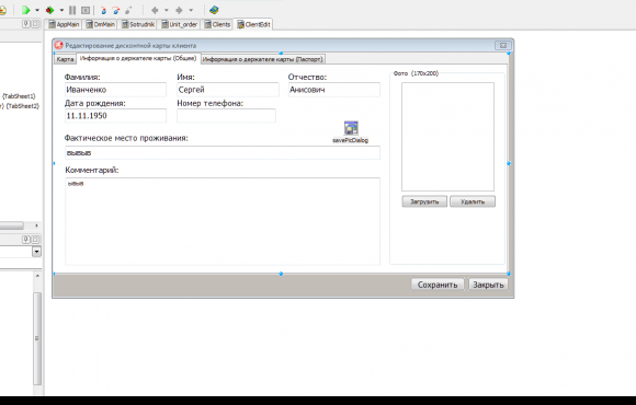 В разработанном проекте на Delphi XE2 производится ведение сведений о дисконтных картах. При добавлении новой дисконтной карты указывается дата создания, номер карты, сведения о держателе карты (фио, дата рождения, номер телефона, адрес проживания, паспортные данные и фото).