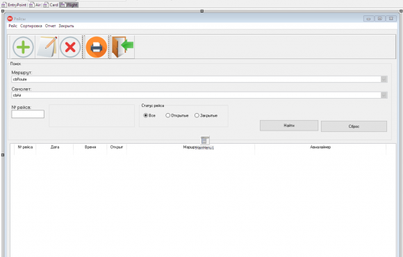 • Рейсы: номер рейса, дата и время вылета, статусы рейса (Открыт/Завершенный);