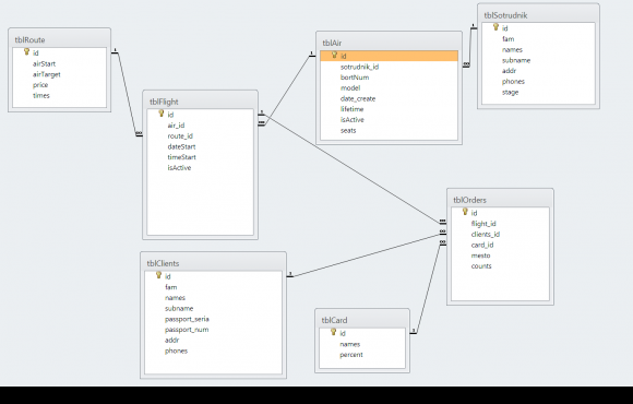Авиакомпания занимается международными и междугородными авиа перевозками пассажиров. Авиакомпанией установлены маршруты полетов: Москва-Сочи, Москва-Ростов-на-Дону и др. Рейсы осуществляются по установленным маршрутам согласно расписанию. За каждым самолетом закреплен командир корабля. Необходимо спроектировать базу данных авиалиний с использованием языка программирования Delphi XE10.1 Berlin и СУБД MS Access. Информация базы данных будет использоваться для определения доходов, приносимых рейсами, даты и времени прибытия самолета в аэропорт назначения, истечения срока эксплуатации самолета и др..