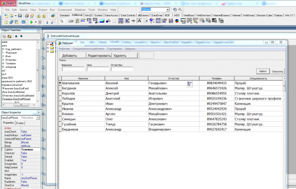 Модуль данных сотрудников (SotrudnikDm) соответственно отвечает за таблицу рабочих. Имеется возможность фильтрации рабочих по фамилии, имени и отчеству. Сортировку можно выполнять по 4 полям: фамилия, имя, отчество и телефон.