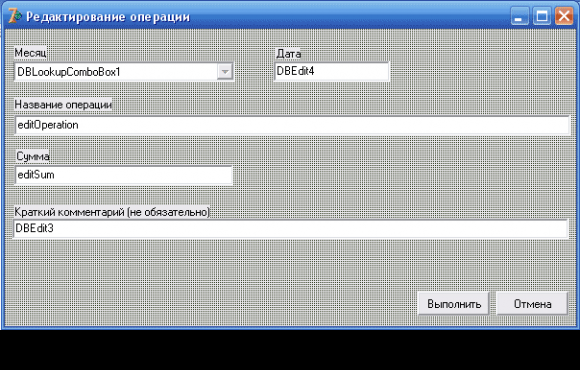 При выполнении учета в программу заносится название операции, сумма, дата операции и описание. Все операции автоматически получают уникальный номер за счет наличии автоинкрементного поля.