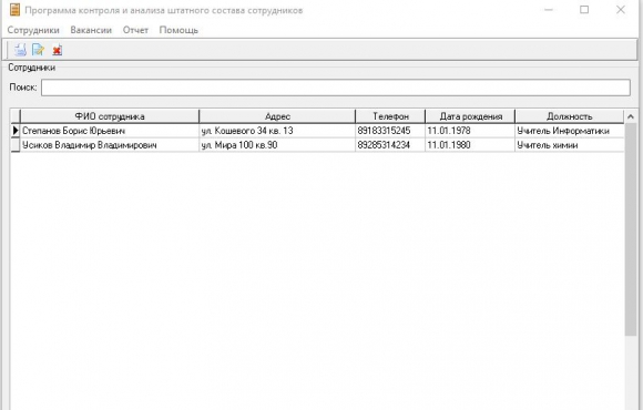 Выполненный проект для курсовой работы по программированию в Delphi на тему - контроль и анализ штатного состава сотрудников в образовательной организации. База данных состоит из нескольких связных таблиц для хранения входных данных. Разработанная программа позволяет через удобный пользовательский интерфейс производить все необходимые манипуляции с данными: добавление, редактирование и удаление. Поиск осуществляется по ФИО, адресу и номеру телефона сотрудника. Перед тем как добавлять учителей в базу данных, через форму "Вакансии" формируется перечень должностей с указанием количества доступных мест.