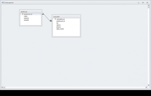Для подключения к данным используется технология ADO. Для этого в модуле данных (TDataModule) используется 3 невизуальных компонента. Один из них для соединения с базой данных - TADOConnection. Он настроен на работу с файлом db.mdb и в качестве поставщика данных применяется Microsoft.Jet.OLEDB.4.0. Также еще два вспомогательных компонента: TADOTable и TDataSource. Компонент TADOTable применяется для представления каждой из таблиц (dolzhnost - должности, sotrudnik - сотрудники), позволяя производить манипуляции с данными, их сортировку и фильтрацию. TDataSource - обеспечивают взаимосвязь визуальных компонентов с источником данных (в данном проекте с TADOTable). Для отображения и редактирования данных используются визуальные компоненты TDBGrid, TDBEdit и TDBLookupComboBox.