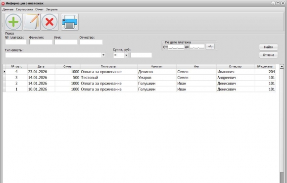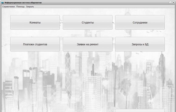 В программе на C++ Builder пользователь может вести сведения о проживающих студентах в общежитии, редактирование жилого фонда в виде доступных комнат, вносить сведения о платежах, принимать и регистрировать в базе данных заявки на ремонт. Также дополнительно имеются отдельные запросы к базе данных, чтобы получить сведения по общим платежам студентов и сведений по степени занятости комнат.