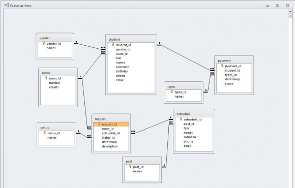 Целью данной работы является создание базы данных в Access для хранения данных по проживающим студентам в общежитии, а также разработка оболочки в C++ Builder для взаимодействия пользователя с данной базой данных. Созданная база данных состоит из связных таблиц и некоторых вспомогательных запросов для формирования вывода данных для пользовательского интерфейса программы.