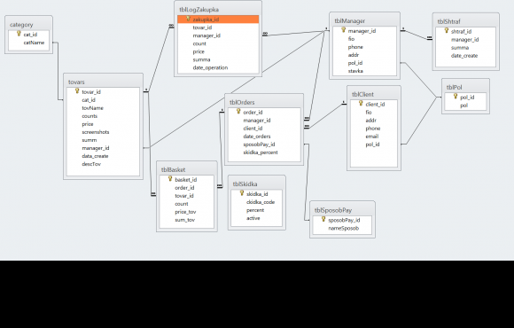 Готовый проект товаров спортивного магазина в Delphi 7 и реляционной СУБД Access. В программе реализован каталог продукции магазина, по которому можно выполнять поиск (фильтрацию), выполнять сортировку по определенным полям базы данных, выводить на печать и экспортировать данные из каталога в формат MS Excel. Для реализации функций продажи задействованы три таблицы - tblOrders (заказы), tblSposobPay (способы оплаты) и tblBasket (корзина вы бранных товаров по заказу).