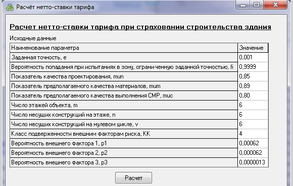 Для начала расчета нужно ввести данные в соответствующие поля. После ввода данных нужно нажать кнопку «Расчет», после чего программа автоматически произведет расчет нетто-ставки страхового тарифа.