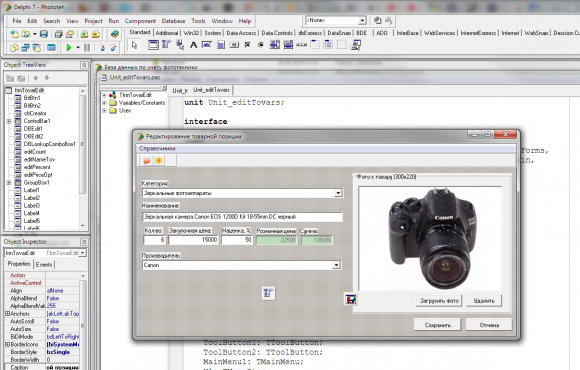 - Работа с фототехникой. Добавление, редактирование и удаление фототехники из базы данных. Розничная цена и сумма вычисляется, если заполнены поле закупочной цены, наценки в % и количества товара.