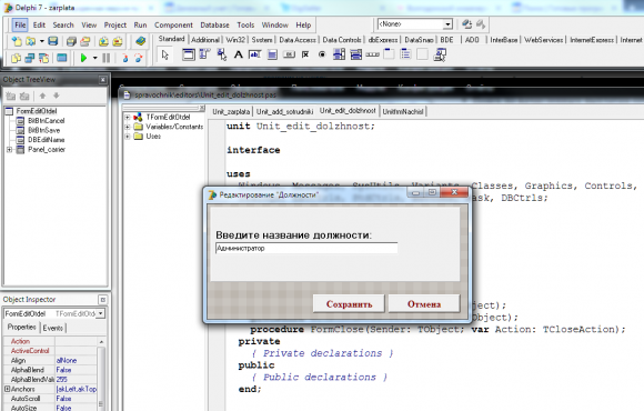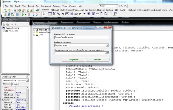 - Редактирование сотрудников. При добавлении сотрудников вносится ФИО, размер оплаты и выбирается из выпадающего списка должность.