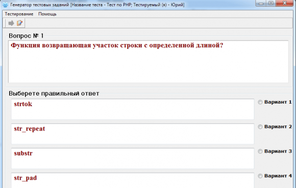 Конструктор тестов отвечает за создание новых тестовых заданий с вариантами ответов, один из которых выбирается как правильный. А генератор тестовых заданий применяется для проверки остаточные знаний по готовым тестам.