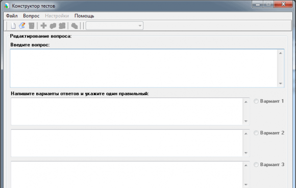 Для создания вопросов к тестам создается специальный файл собственного формата. Число вопросов в тесте не ограничено. К каждому вопросу доступно 4 варианта ответа, 1 из котрых должен быть правильным. После наполнения файла тестирования вопросами, необходимо также сделать небольшую настройку: указать количество тестовых заданий для выполнения для получения результата удовлетворительно, хорошо и отлично указать порог в процентах. (К примеру: "Удовлетворительно": 70; "Хорошо": 85 и "Отлично": 95).