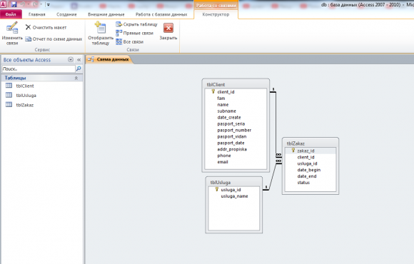 Готовая курсовая база данных Delphi по технологии программирования на тему - разработка АИС по учету предоставления населению государственных услуг в среде разработки программ Delphi 7. Для хранения данных об услугах используется СУБД Access, в которой создано 3 связанных таблицы: клиенты, услуги и таблица в которой записываются услуги клиентов.