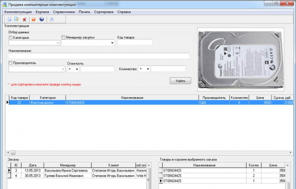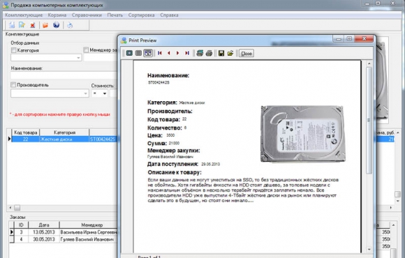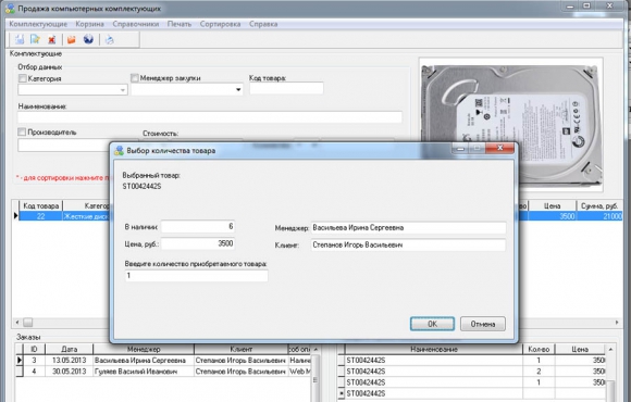 После того как в проекте программного обеспечения для работы с базой данных комплектующих заполнены все справочники, можно произвести добавление товарных позиций с указанием справочных данных, название товара, фотография, стоимость, дата поступления и количество компьютерных продуктов в наличии.