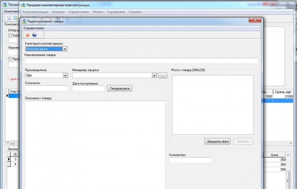 После того как в проекте программного обеспечения для работы с базой данных комплектующих заполнены все справочники, можно произвести добавление товарных позиций с указанием справочных данных, название товара, фотография, стоимость, дата поступления и количество компьютерных продуктов в наличии.