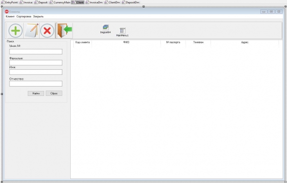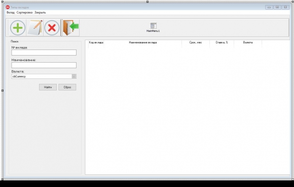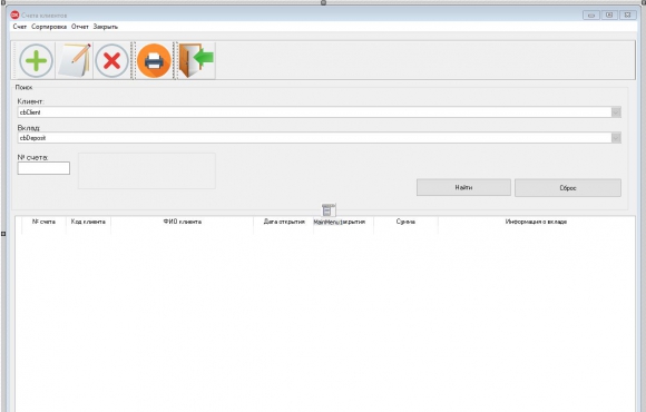 Задачей, разработанного прикладного программного обеспечения, является учет сведений по клиентским вкладам в банковской сфере деятельности. В нем ведется учет сведений о клиентах, видах вкладах и сделанных вложений клиентами в той или иной валюте. Через программу можно производить добавление, редактирование и удаление записей из базы данных. Сама база данных является реляционной. Все данные разбиты на 4 таблицы: "Валюта", "Вклады", "Клиенты" и "Счет". Готовая программа также умеет выполнять поиск и сортировку по видам вкладов, по базе клиентов и по счетам клиентов (вкладам). В модуле для работы с вкладами клиентов, помимо сортировки и поиска, можно производить вывод данных на печать и или экспортировать в формат PDF или CSV.