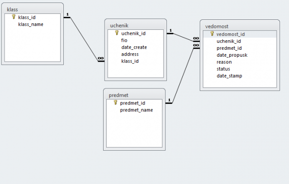 База данных представлена в виде четырех взаимосвязанных таблиц: класс, предмет, ученик и ведомость.