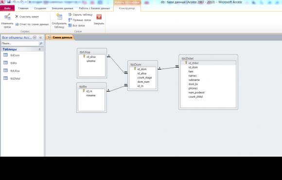 База данных состоит из 4 таблиц. В состав проекта учета жильцов на Delphi входит 9 форм (представлены на скриншотах): главная форма окном для редактирования жильцов, справочник улиц с формой редактирования, справочник районов с формой редактирования, справочник о домах с формой редактирования, форма для создания отчета.