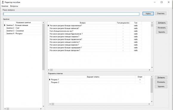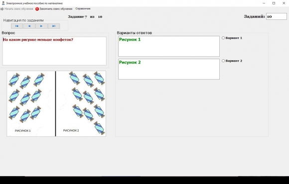 Программа предназначена для ознакомления детей с основами математики. При запуске обучения, по выбранной теме, программа показывает вопрос, а также при необходимости изображение, из которого нужно сделать выбор и дать подходящий ответ.