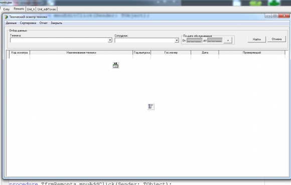 Каждый из модулей поддерживает сортировку, поиск (фильтрацию) и печать. В модуле по учету сельхозтехники отчет формируется с помощью компонента QReport. Один отчет по выделенной записи с подробными сведениями, а другой выводит список техники. В модуле техосмотра отчет формируется в формате Excel, для выполнения экспорта данных.