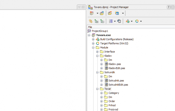Исходный проект в Delphi XE2 на тему учета товаров на складе в некоммерческой фирме разработан по принципу модульной архитектуры, в которой все сущности базы данных разделены на отдельные каталоги с файлами форм редактирования.