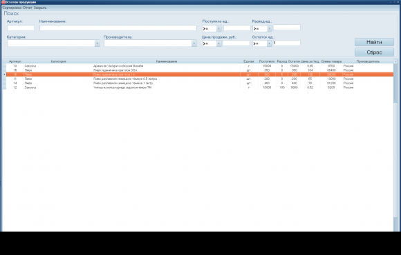 Программа позволяет вести ассортимент имеющейся пивной продукции (пиво, закуски, тара), учет всех поставок, возможность просматривать остатки имеющейся продукции в баре и функционал, обеспечивающий реализацию товаров. При оформлении заказа (продажи) производится выбор продукции, выбор менеджера, возможность указать какой это заказ (на вынос или столик в баре), указывается обязательно количество и также имеется возможность делать скидку.