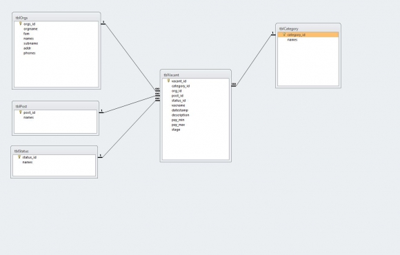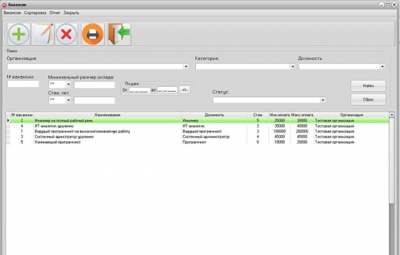 Для автоматизации приема сведений о имеющихся вакансиях на предприятиях города необходимо разработать приложение, которое позволит вести сведения об организациях и поступающих от них вакансий. Электронное хранение этих сведений позволяет оперативно формировать отчеты, как в электронном виде, так и с возможностью быстро распечатать нужный документ со сведениями о вакансии. При поступлении запроса на какую-либо имеющуюся вакансию становится возможным быстрый поиск по БД.